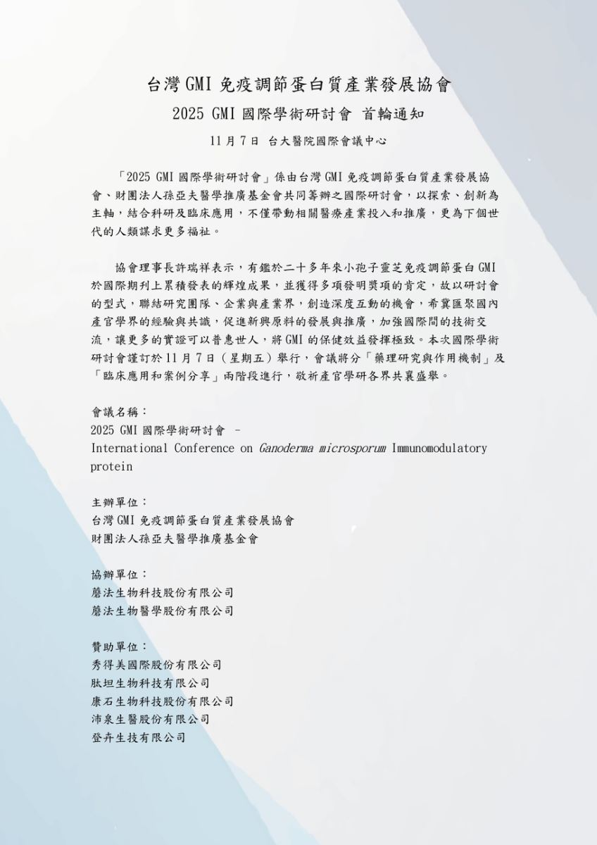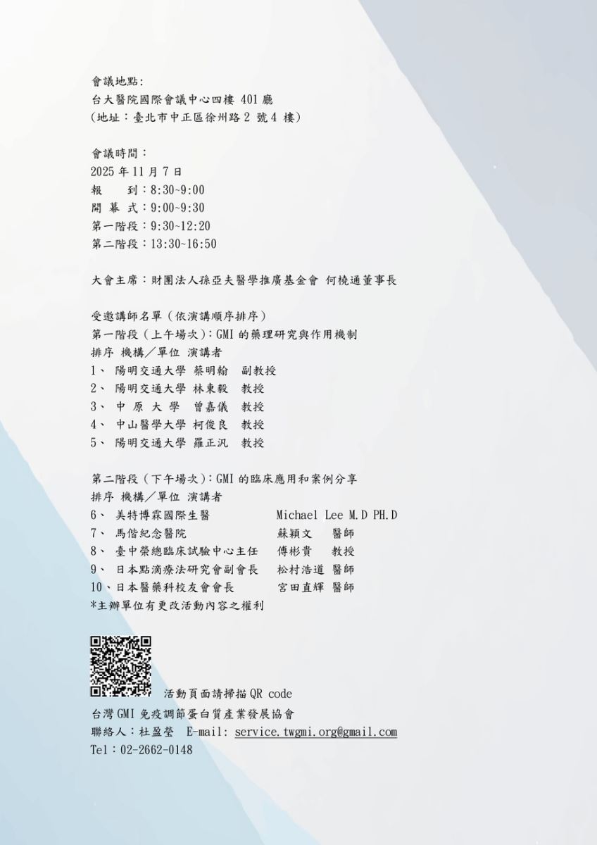 2025【GMI國際學術研討會】謹訂於114年11月7日(星期五) ,假台大醫院國際會議中心四樓401廰舉行。